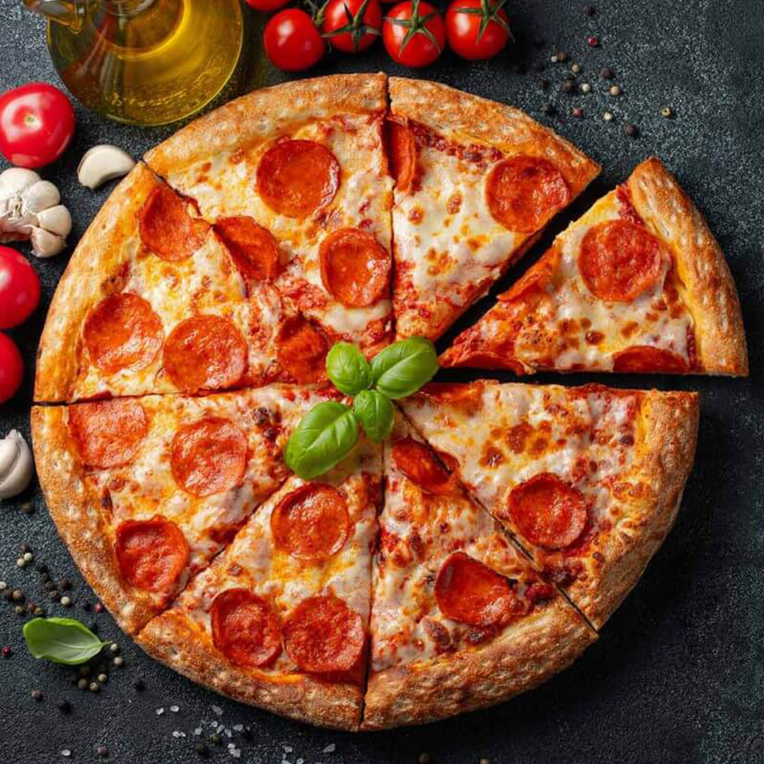 خمیر مخصوص، سس مارینارا، پنیر میکس شده، 120 گرم پپرونی، فلفل هالوپینو