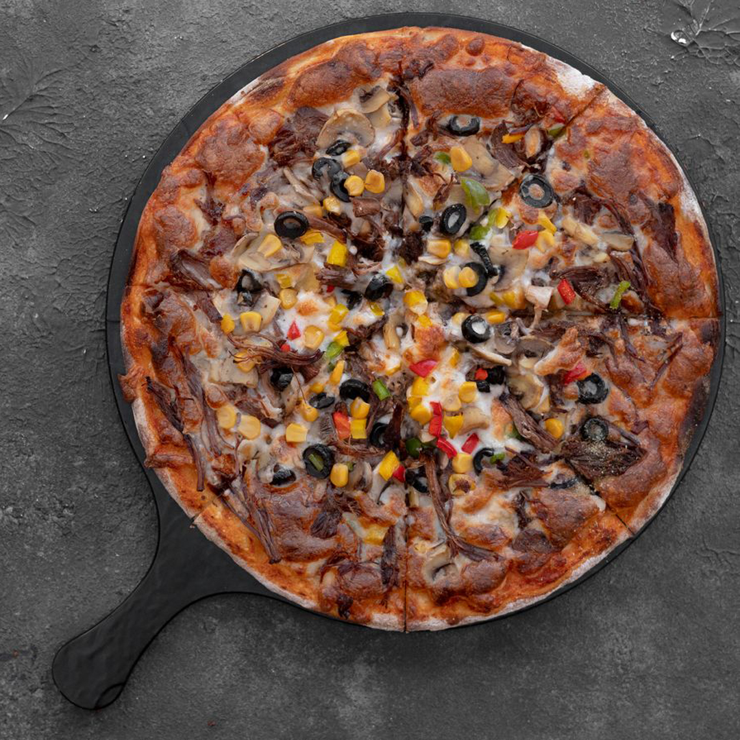 خمیر مخصوص، سس قارچ، 120 گرم گوشت رست بیف، پنیر میکس شده، زیتون اسلایل، فلفل دلمه