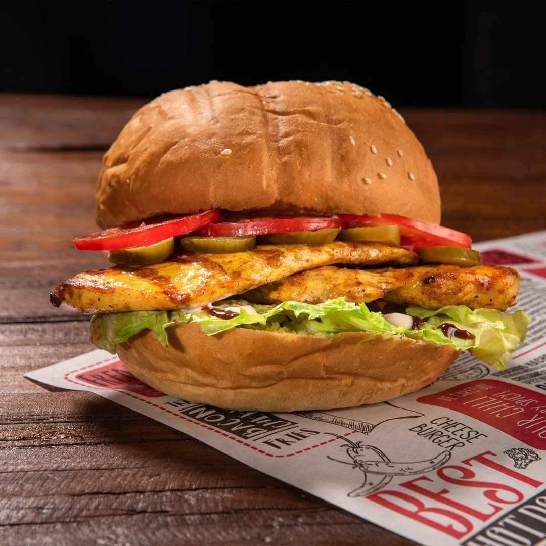 نان و سس مخصوص برگر، کاهوی فرانسوی، خیارشور، گوجه، 150 گرم سینه مرغ، + سیب زمینی و سالاد کلم