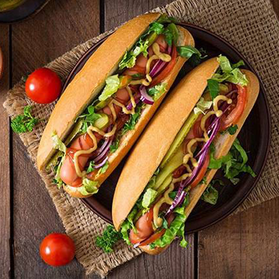 نان مخصوص، سس مخصوص، 200 گرم ژامبون 90% ، پنیر میکس شده، فلفل دلمه، قارچ، کاهو فرانسوی، خیارشور، گوجه + سیب زمینی و سالاد کلم